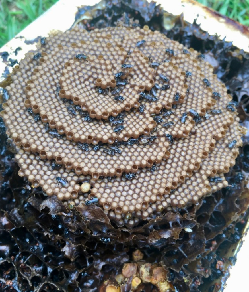 The inside of a Tetragonula carbonaria stingless bee hive, showcasing the spiral brood pattern and the queen, the bee with a lighter-coloured, enlarged abdomen near the centre of the photo.