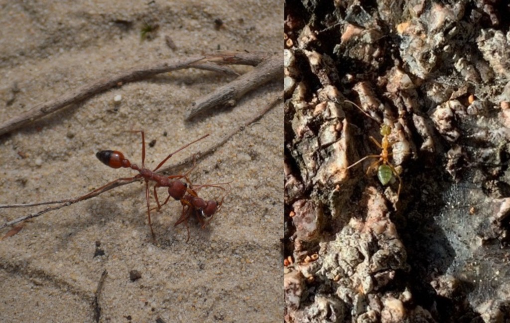 On the left are two Australian giant bull ants (Myrmecia gulosa) that were fighting and on the right, a green weaver ant (Oecophylla smaragdina).