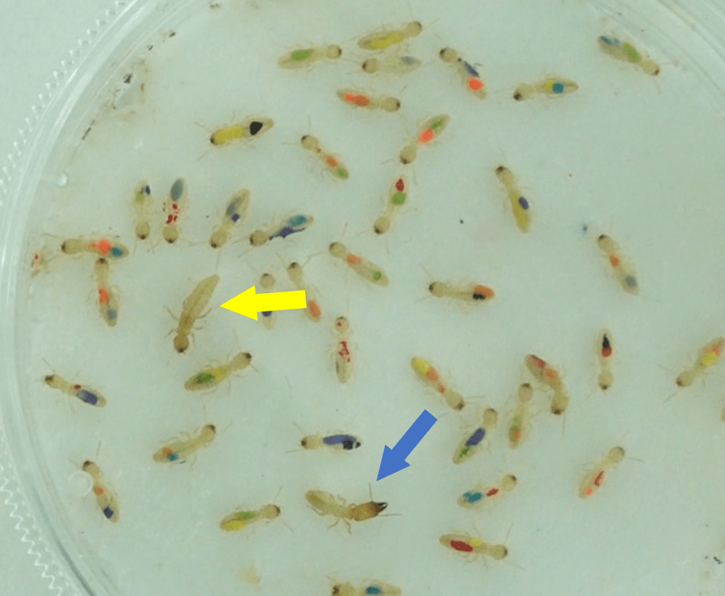 Termites marked with color codes. The yellow arrow points out the queen, the blue arrow the soldier.