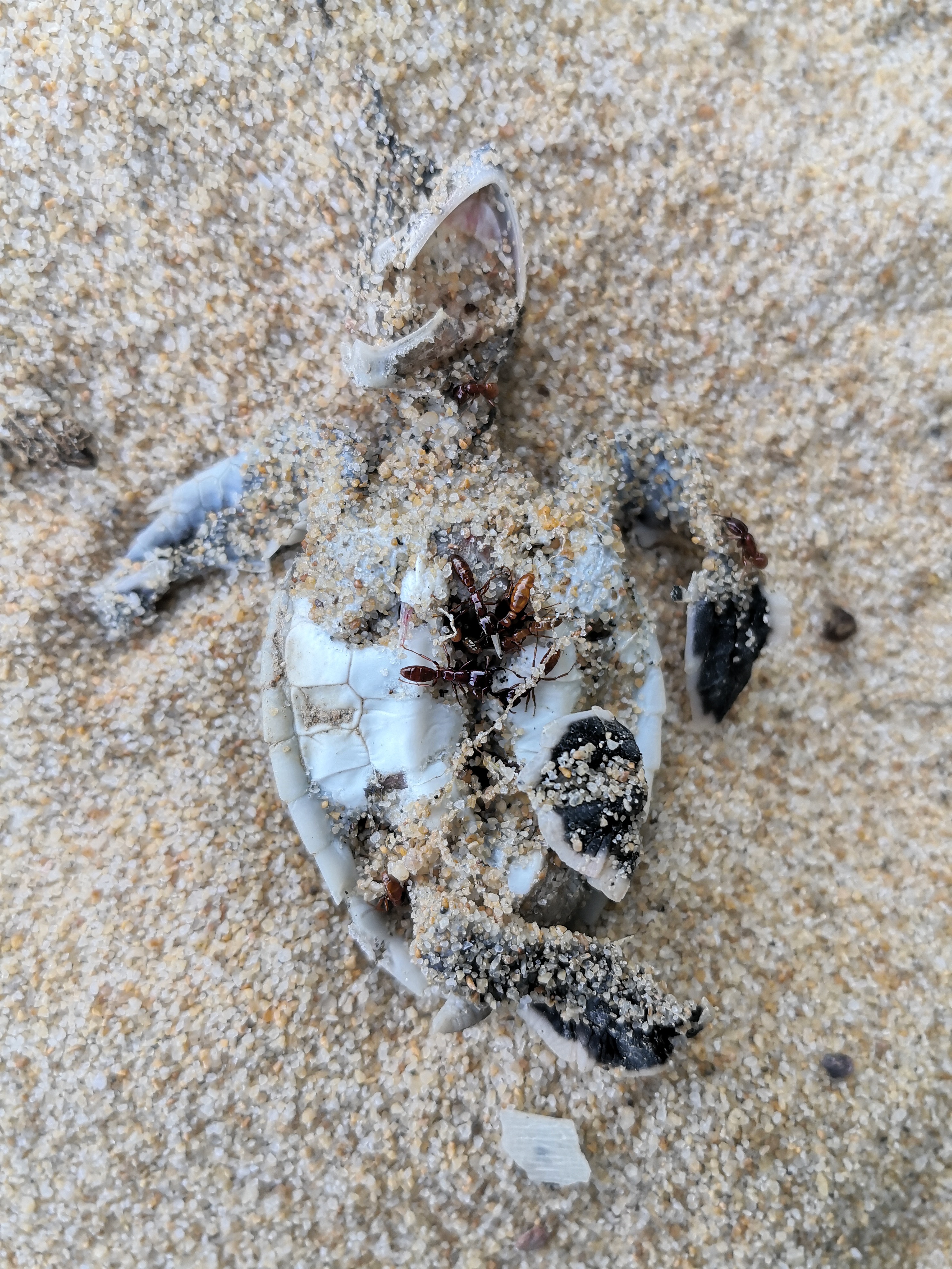 Jason: This led me to becoming a full-time sea turtle conservationist in 2020 after concluding my research with Sze Huei on yellow crazy ants (Anoplolepis gracilipes) on Lang Tengah Island. In 2021, while excavating green sea turtle (Chelonia mydas) nests on one of the nesting beaches in mainland Terengganu, Malaysia, we stumbled upon a shocking but fascinating discovery: sea turtle hatchlings (some even still alive) were being eaten by ants. I had to get in touch with Sze Huei – there were so many questions that needed to be answered!