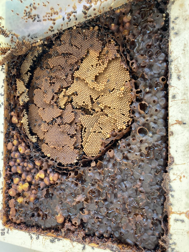 The brood comb and surrounding food pots of a Tetragonula carbonaria colony in a wooden nest box.
