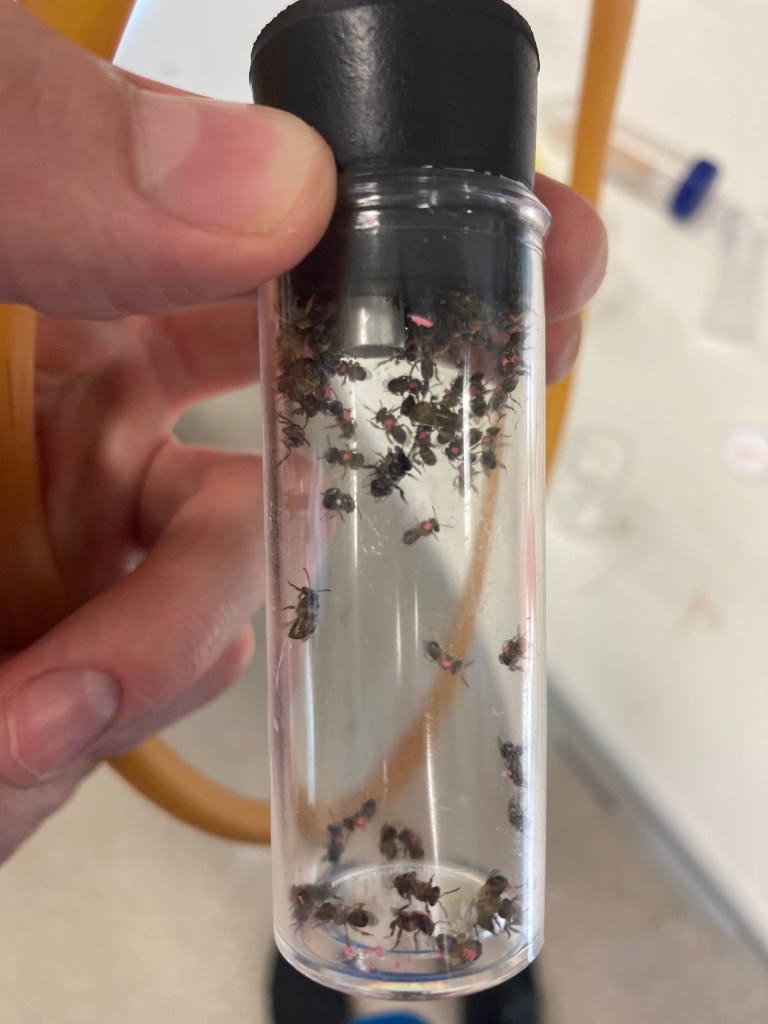 Newly marked stingless bees in a pooter vial ready for release into the colony.