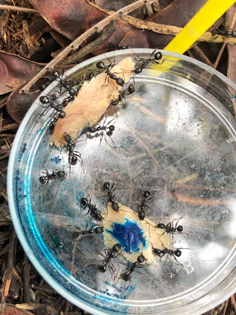 After some observations on intra-specific and neighborhood competition in the gypsy ants, I found the ant workers simply increased movement speeds foraging under the pressure of competition. I put a Petri-dish to cover one of the ant nest openings in the neighborhood, and calculated the time spent on food discovery, removal and retrieval. I also assigned two different food items: one light and one heavy, in a food patch put at various distances. When an ant nest opening was blocked, ants from the rival nest opening appeared sluggish with an increased time spent on food removal and retrieval. Now that the neighbors are being suppressed by some strange human being using glassware to do stuff, what’s the hurry? There was also no apparent selectivity shown over the light/heavy foods. Therefore, to “grab and run” was the rule in the neighborhood relationships.