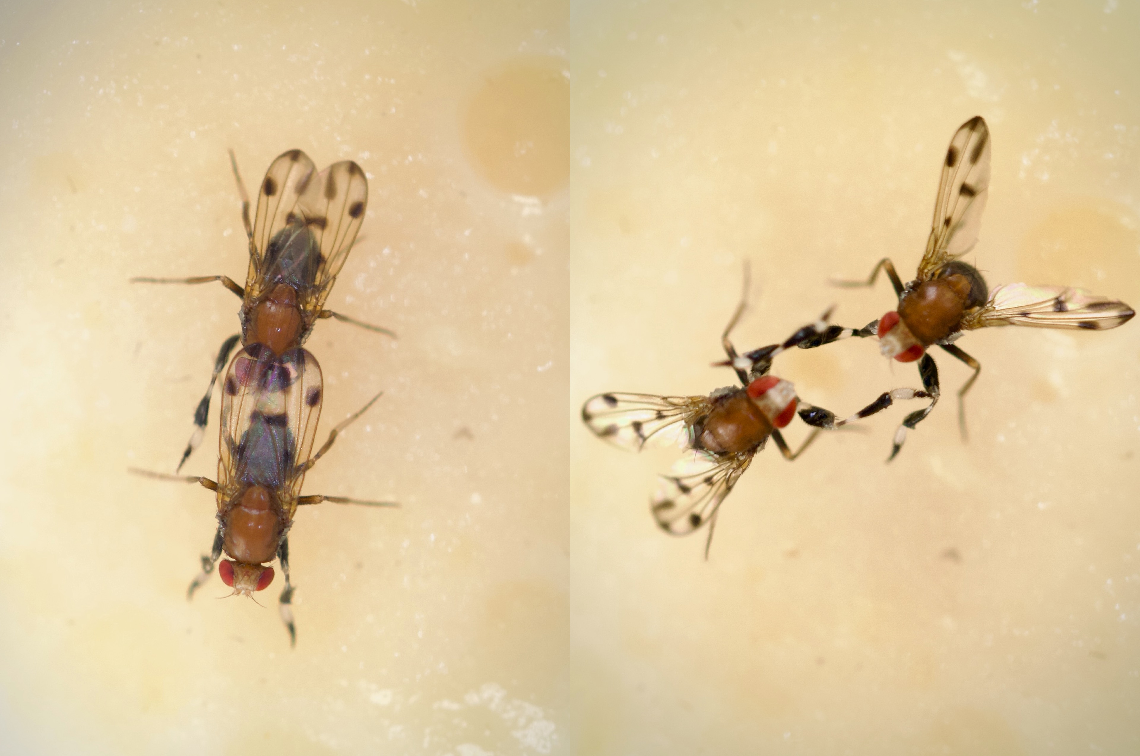 Aggressive encounter between two male Drosophila prolongata. In the first image (left), one male chases the other, leading to an escalation into a fight involving leg fencing (right).