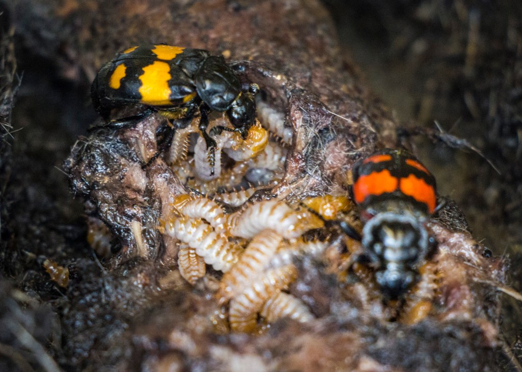 Burying beetles are my favourite social insects. I studied them during my PhD and still find their social behaviour incredibly enigmatic–most of which takes place on or inside the decaying carcass of a vertebrate! In a sense, what is a crypt to some is a cradle for burying beetles. Aside from their important ecological role as efficient buriers of small rodent and bird corpses, the complexity of their social interactions within family is, to me, unparalleled in the arthropod world. These behaviours include larvae begging for food and parents regurgitating a “soup” of pre-digested carcass flesh to feed them. Conveniently, burying beetles are mostly undisturbed by experimental conditions, making their behaviour relatively easy to observe and study in the lab.