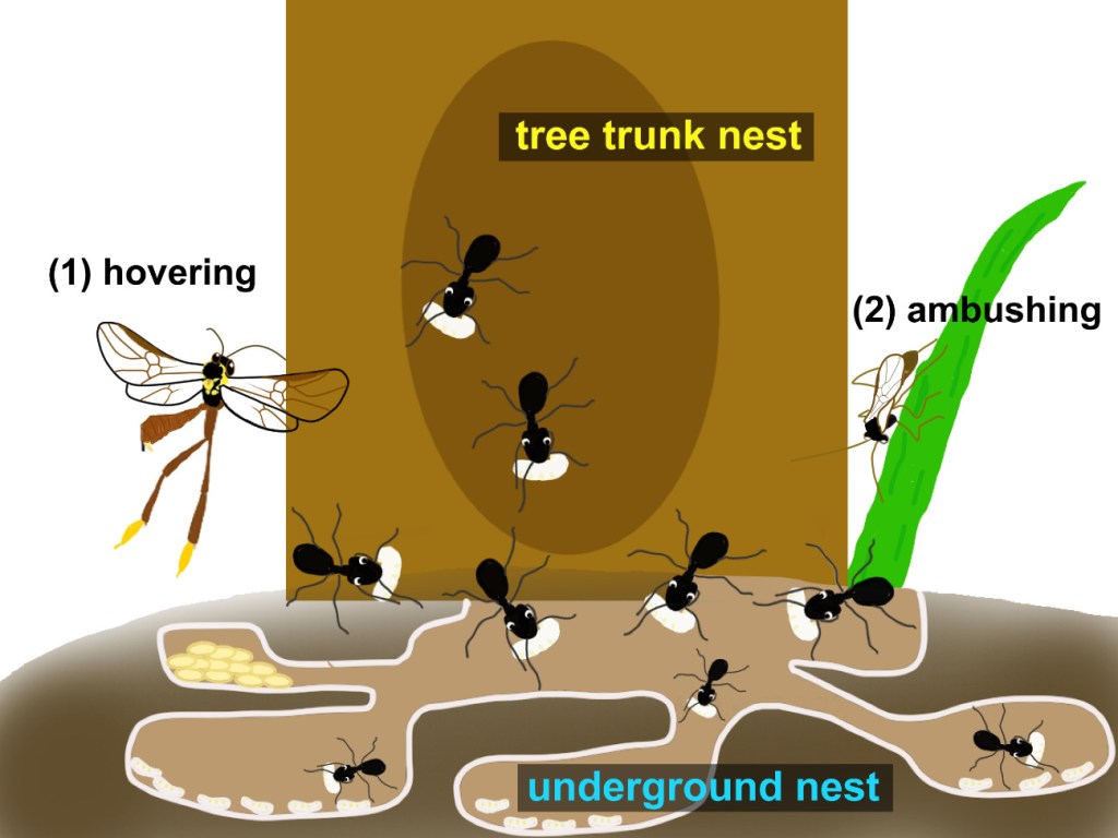 Two basic host-searching strategies are known: (1) hovering near ant nest entrance and (2) ambushing along ant trails by clinging to vegetation.