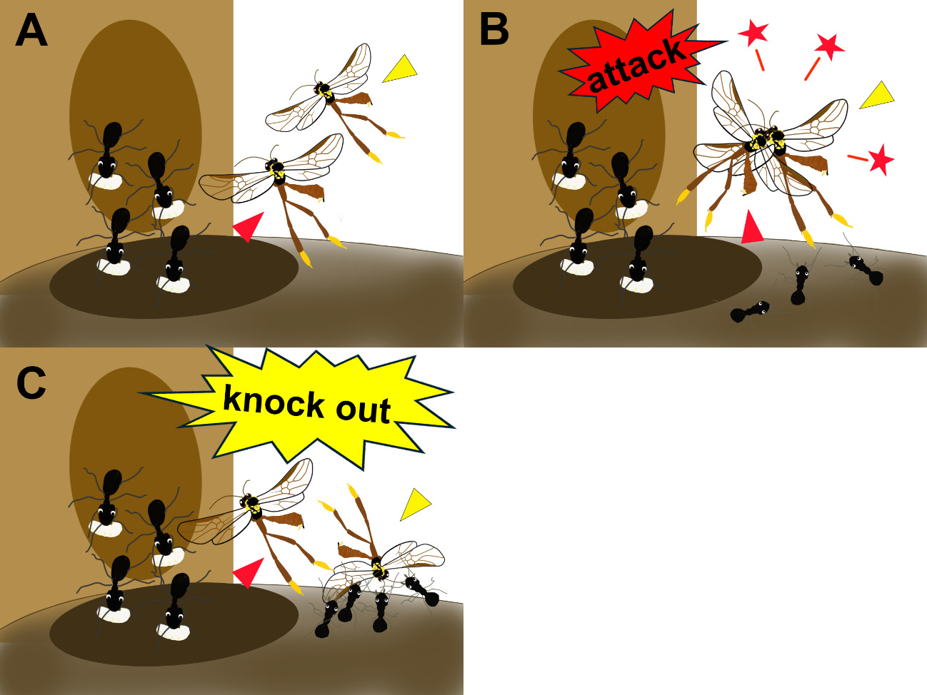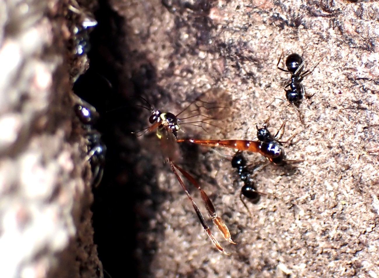 One day I witnessed something remarkable. A female O. cremieri hovered at the nest entrance and approached larvae being carried by workers. When several females were present, they sometimes engaged in aerial jostling: the wasp positioned in front of the nest (red arrow in the image below) drove off an approaching female (yellow arrow) by pushing her while hovering. The displaced wasp was then attacked by ants and dragged into the nest, showing how dangerous it can be for wasps to approach ant brood. Aggressive competition between parasitoid females has been observed before in other ichneumonids, but usually on the ground or on plants — witnessing physical pushing while hovering appears to be a novel behaviour.